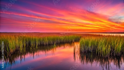 © ole, Obraz premium Vibrant Sunset Over Marshlands with Reflections in Still Water and Lush Green Grass