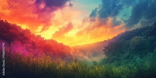 © NpicArt, Obraz premium Vibrant Sunset Over Misty Forest Valley Landscape