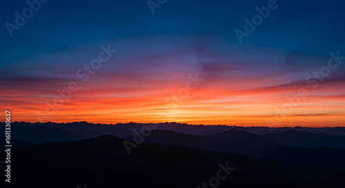 © Mucher, Obraz premium Vibrant Sunset over Misty Mountain Range