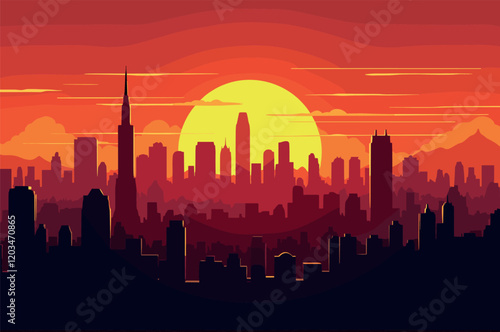 © Katyam1983, Fototapeta premium Vibrant Sunset Over Modern City Skyline