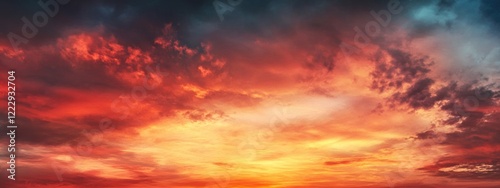 © AugmentArt, Fototapeta premium Vibrant Sunset Over Mountain Horizon with Dynamic Cloud Formation and Ample Space for Text Overlay