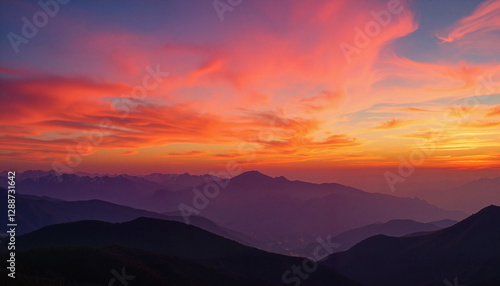 Fototapeta premium Vibrant sunset over mountain range silhouette, natural wonder