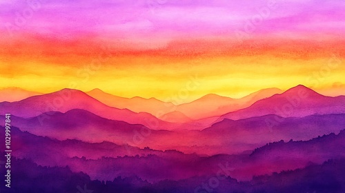© Evalva786, Fototapeta premium Vibrant Sunset Over Mountain Range Watercolor Painting Abstract Gradient Background with Copy Space