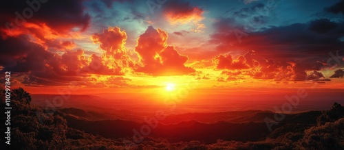 Naklejka premium Vibrant Sunset Over Mountain Range with Dramatic Clouds and Golden Sky