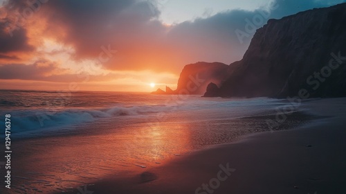 © Vader Stocker, Fototapeta premium Vibrant Sunset Over Ocean Beach with Dark Rocks