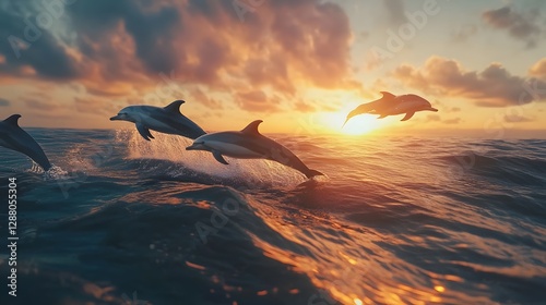 © MakeitEasy, Obraz premium Vibrant sunset over ocean, colorful clouds and sun glowing on horizon, serene landscape perfect for relaxation or inspiration.