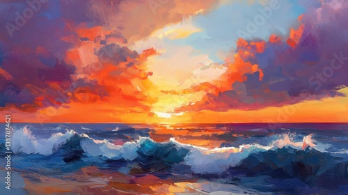 Naklejka premium Vibrant Sunset Over Ocean Waves - Impressionist Seascape Painting