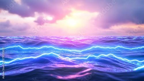 Obraz premium Vibrant sunset over ocean waves with neon blue energy lines