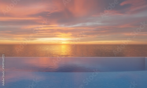 © Keluarga Berkah, Fototapeta premium Vibrant sunset over ocean with infinity pool reflection, tranquil luxury scene