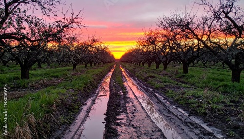 © Kitta Studio, Fototapeta premium Vibrant Sunset over Orchard Path with Reflections on Wet Soil