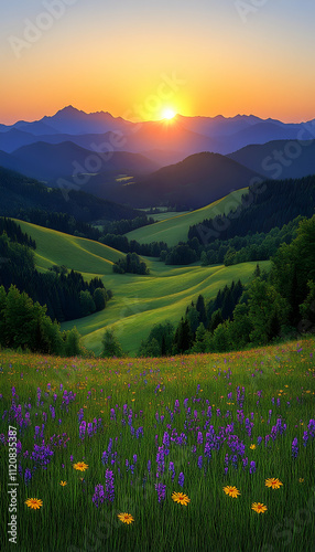 Fototapeta premium Vibrant sunset over rolling hills and wildflowers.