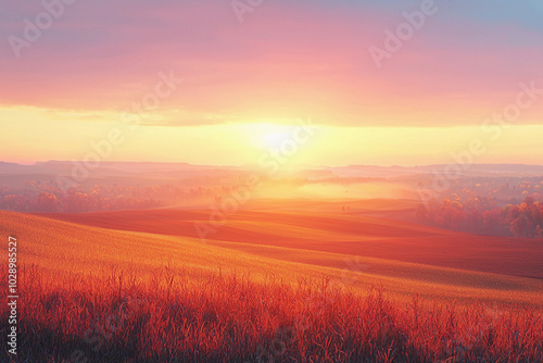 © pavlofox, Obraz premium Vibrant sunset over rolling hills with misty valleys in the background