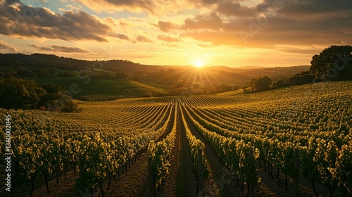 © Arfi Studio, Fototapeta premium Vibrant sunset over rolling vineyards.