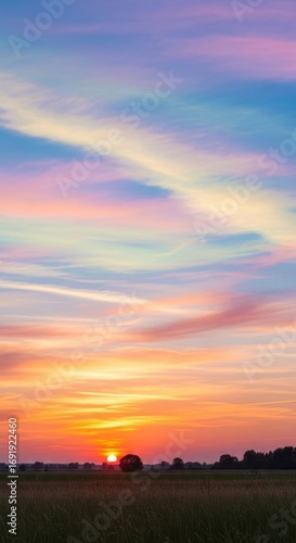 © MuhammadArsya, Fototapeta premium Vibrant Sunset Over Rural Landscape with Colorful Sky and Silhouetted Horizon.
