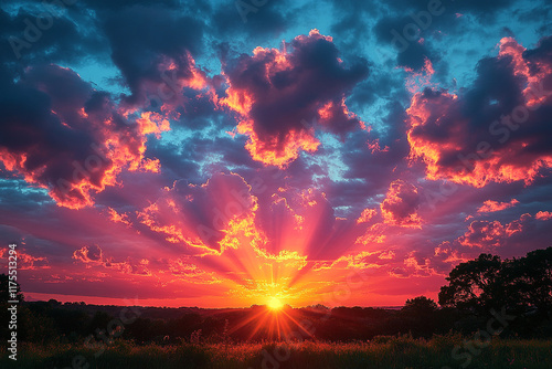 © Design Adelsa, Obraz premium Vibrant Sunset Over Rural Landscape With Dramatic Clouds