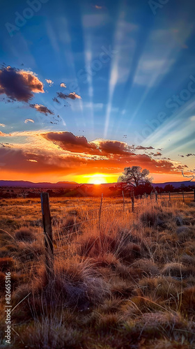 © Bartek, Fototapeta premium Vibrant Sunset Over Serene Field in Santa Fe, New Mexico with Radiant Sky, Grassy Landscape, and Majestic Silhouette of a Tree - Tranquility and Natural Beauty at Dusk
