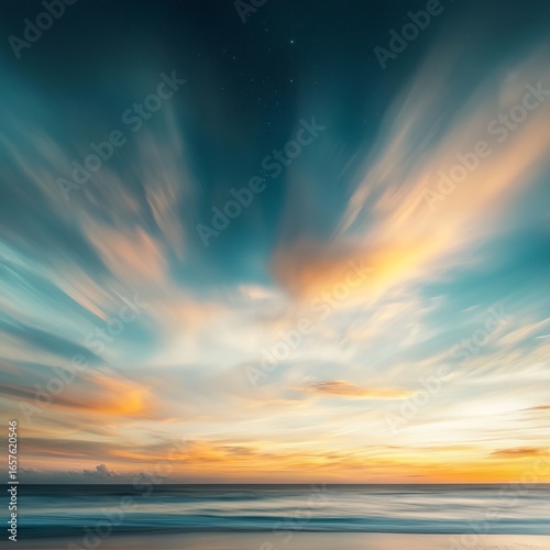 © Supatinee, Obraz premium Vibrant Sunset Over Serene Ocean with Dramatic Cloud Patterns