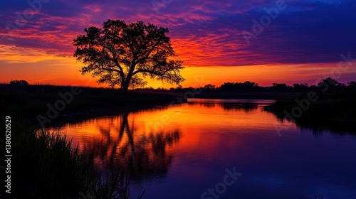 © ayu sulistyaningtyas, Obraz premium Vibrant Sunset over Serene River and Silhouetted Tree