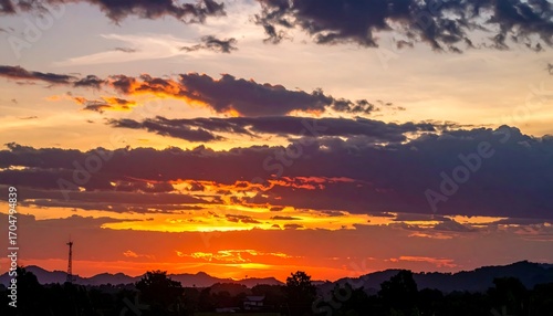 © Xera, Fototapeta premium Vibrant sunset over silhouetted landscape with dramatic clouds.