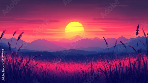 © Almahyra, Fototapeta premium Vibrant sunset over silhouetted mountains and tall grass. (1)