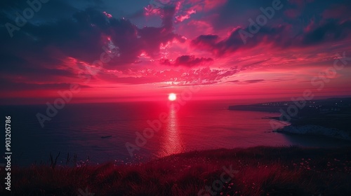 Obraz premium Vibrant sunset over the ocean at dusk in coastal location