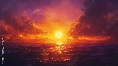 © Pure Imagination, Obraz premium Vibrant Sunset Over the Ocean with Dramatic Clouds