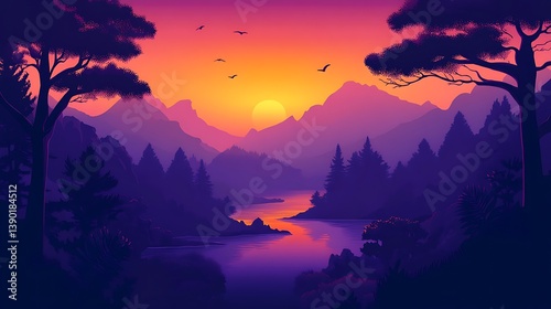 © Gandulane, Naklejka premium Vibrant sunset over tranquil mountain lake.