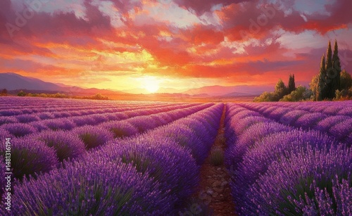Fototapeta premium Vibrant sunset over vast lavender fields with rows of blooming purple flowers...