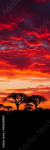 Fototapeta premium Vibrant sunset paints the African sky in fiery hues over silhouetted acacia trees, creating a breathtaking natural panorama, acacia, wilderness