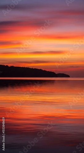 © rakhul, Fototapeta premium Vibrant sunset paints the sky and reflects beautifully on calm water.