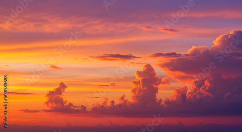 © Hamid, Fototapeta premium Vibrant sunset paints the sky with fiery oranges, deep purples, and soft pinks, illuminating dramatic, textured clouds in a breathtaking atmospheric display.