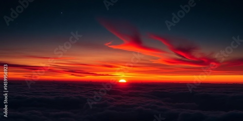 © Thiti, Obraz premium Vibrant sunset panorama, orange sun, red clouds, starry night sky, horizon, vibrant