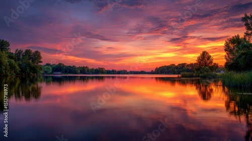 Obraz premium Vibrant sunset reflected in calm lake water, trees line the shore