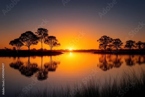 Fototapeta premium Vibrant sunset reflecting on calm lake with silhouetted trees