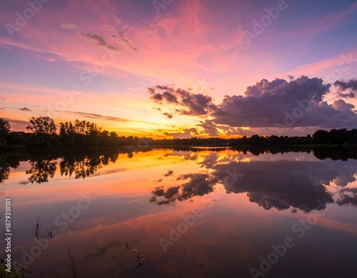© Hassan, Fototapeta premium Vibrant sunset reflecting on tranquil lake surface, creating a serene scene.