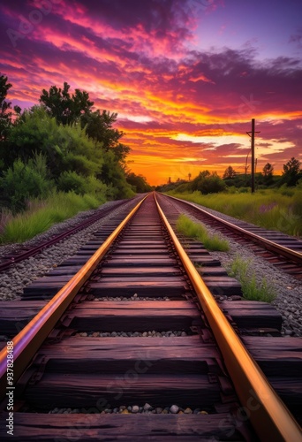Obraz premium vibrant sunset reflecting weathered train tracks creating beautiful landscape...