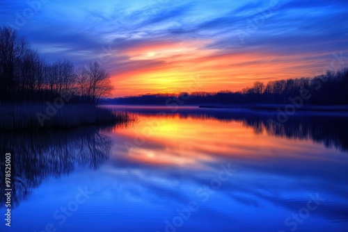 © Hitam Putih, Fototapeta premium Vibrant Sunset Reflection over Tranquil Lake