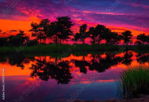 Obraz premium vibrant sunset reflections serene waterscape colorful sky calm water surface,...
