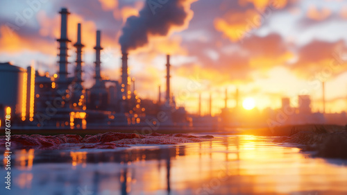 © Quality One , Fototapeta premium vibrant sunset reflects on water in foreground, with industrial plant emitting smoke in background. scene captures contrast between nature and industry, evoking sense of awe