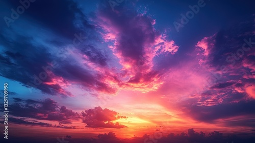 © poster, Fototapeta premium Vibrant sunset sky, colorful clouds, evening, ocean horizon, background image