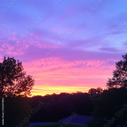 © ADD PHOTO, Fototapeta premium Vibrant Sunset Sky Over Silhouetted Trees in Lush Forested Landscape