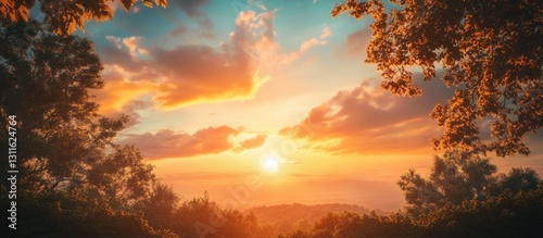 © Rasim, Obraz premium Vibrant sunset with orange and pink hues above lush green trees framed by clouds creating a serene landscape view in a tranquil nature setting