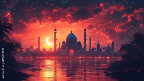 © Micro, Fototapeta premium Vibrant Sunset with Silhouette of a Mosque and Reflection on Water
