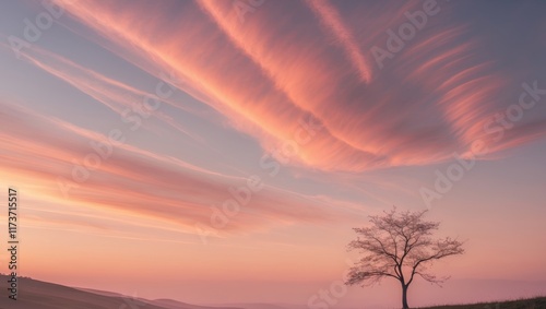 Fototapeta premium Vibrant sunset with wispy clouds over a serene landscape featuring a solitary...