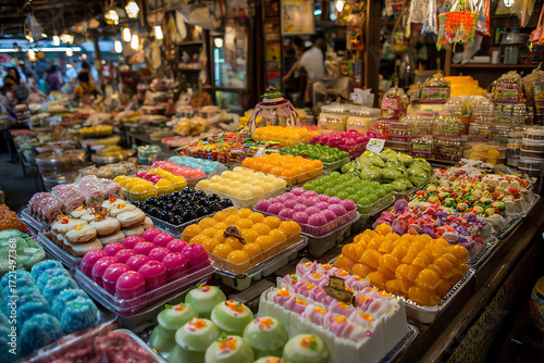 © Phatcharaphon, Fototapeta premium Vibrant Sweet Display in Market: A kaleidoscope of vibrant, colorful sweets and desserts tempt customers at a bustling market.