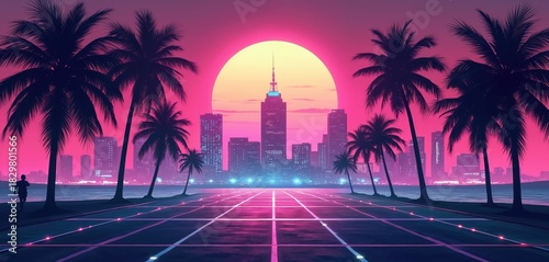 © Viktor, Naklejka premium Vibrant synthwave sunset over Miami skyline with palm trees. Retro cityscape by ocean. Neon lights glow on grid pattern road. Silhouette jogger runs near water.