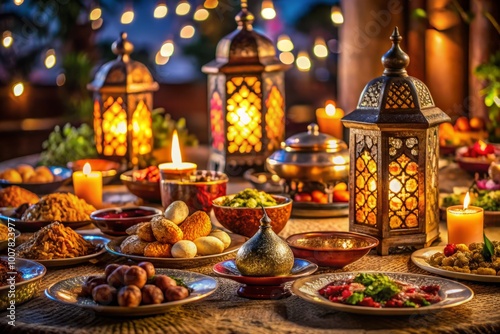 Naklejka premium Vibrant table setting with traditional Middle Eastern dishes, lanterns, and intricate patterns, capturing the warm