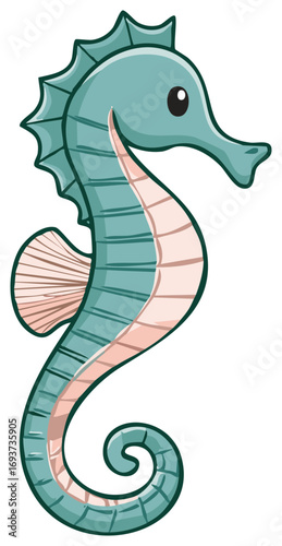 © Юлія Кучер, Naklejka premium Vibrant teal cartoon seahorse illustration cheerful marine animal character