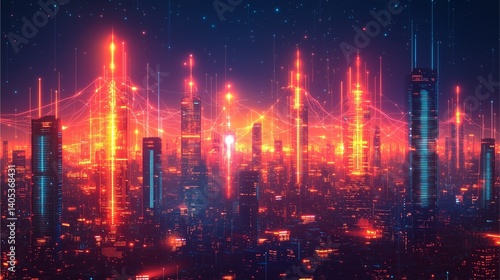 Fototapeta premium Vibrant tech skyline futuristic city digital art urban environment night view innovation concept