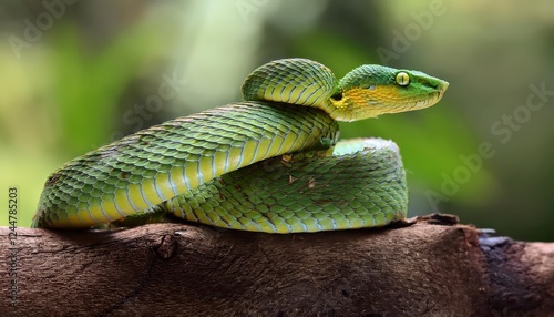 Obraz premium Vibrant Temple Pit Viper Perched on Weathered Wood Piece, Indonesia A...